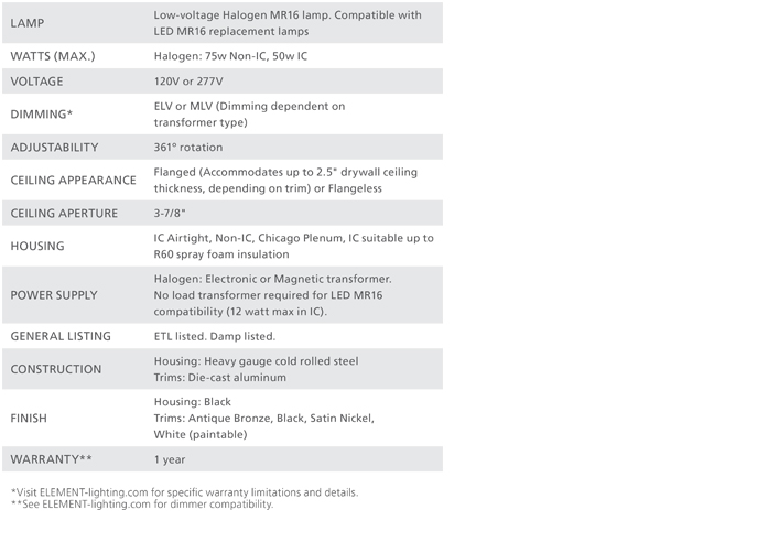 Installing ELEMENT is easy. Product includes butterfly brackets and adjustable steel hangar bars.Flanged trims have minimal thickness.Flangless trims include a crack-resistant plaster plate with no-fill collar that installs after the ceiling to prevent plaster cracking by unifying the plate, ceiling, and housing.Integral gunsights for positioning with laser levels ensure consistent alignment during installation.