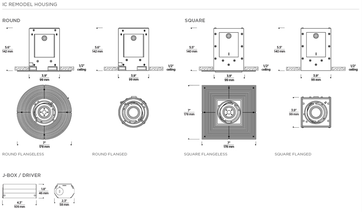 The ELEMENT 3" LED Downlight Remodel Adjustable IC offers a below-the-ceiling installation where a seamless, mud-in look or a traditional flanged appearance is desired in an insulation-contact application. Additionally, the New Construction Mounting option, offered in the same product series, provides additional installation flexibility and a small housing that fits into tight ceiling conditions. This product utilizes a similar LED module as our ELEMENT 2" Platform to accommodate the smaller housing, and features a 40° tilt and 361° rotation. The Flangeless mud plate is integral to the housing while still allowing below-the-ceiling servicing and installation. Die-cast trims are offered in Square or Round, Beveled or Flat, and Flanged or Flangeless. Finishes match ELEMENT New Construction trims for a coordinating aesthetic. IC-Rated and airtight Tool-free aiming and locking: 0°-40° tilt and 361° rotation Flangeless mud plate allows below-the-ceiling servicing and installation Trims match the ELEMENT 3" Platform Suitable for confined plenums Available with optional New Construction mounting hardware Reverse-phase, forward-phase, and TRIAC dimming down to 1% Multiple trim reflector options are available Solite Soft Focus lens options are available 1-step static white, 2-step warm dim and tunable white