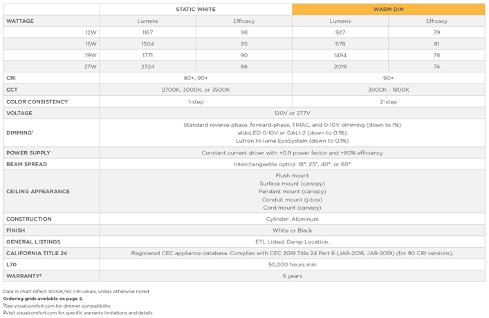 Interchangeable optics: 18°, 25°, 40°, and 60° 1-step static white and 2-step warm dim color binning Available in 2" and 3" fixed and adjustable options; 3" available in wall wash Flush, surface, cord, conduit, and pendant mounting options Several lens and louver options including Solite Soft Focus Decorative trims available in natural brass, crystal, walnut, weathered oak wood, and alabaster