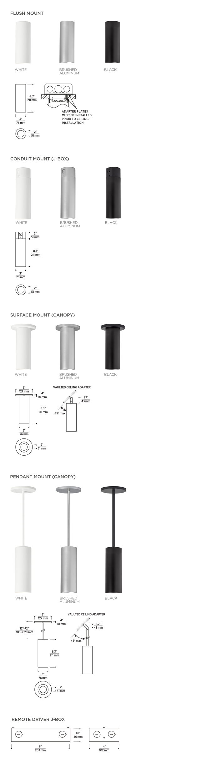 The ENTRA 3" Wall Wash Cylinder provides a cost-effective option with a modern aesthetic for residential, hospitality and commercial applications. ENTRA 3" Wall Wash Cylinders are a great solution for illumination in exposed ceiling applications. Mounting options include Flush Mount, Surface Mount, Pendant Mount and Conduit Mount. LED is recessed in the cylinder minimizing glare with Warm Dimming and Static White options. Available in Black, Brushed Aluminum and White (field paintable)Optimized Wall Wash beam distribution 1-step standard color binning Standard phase and 0-10V dimming down to 1%